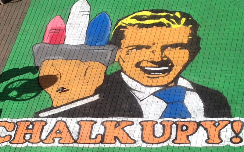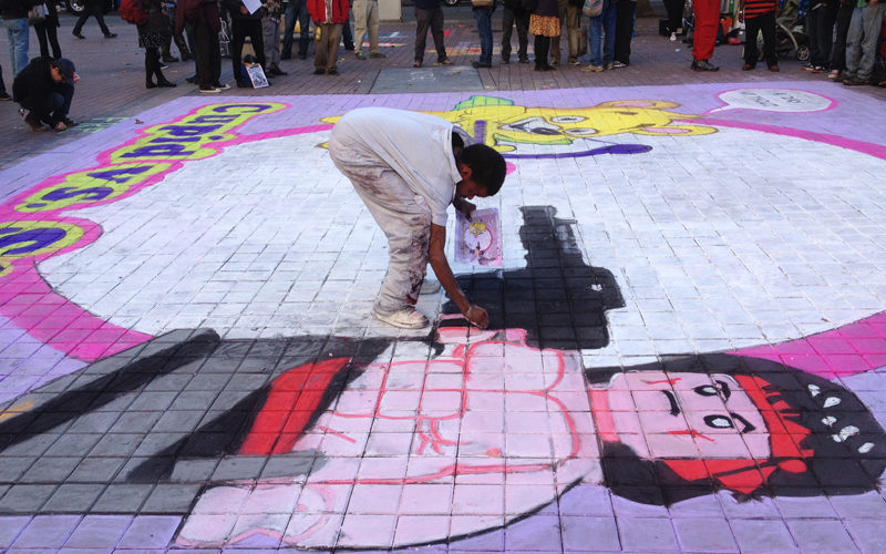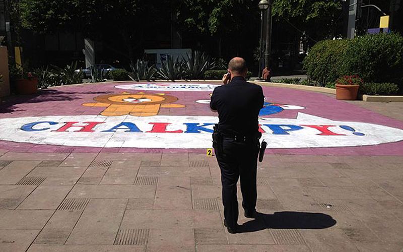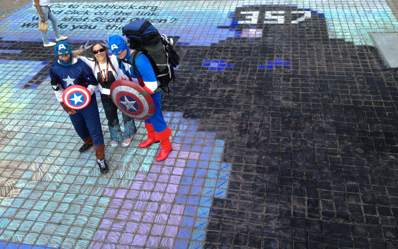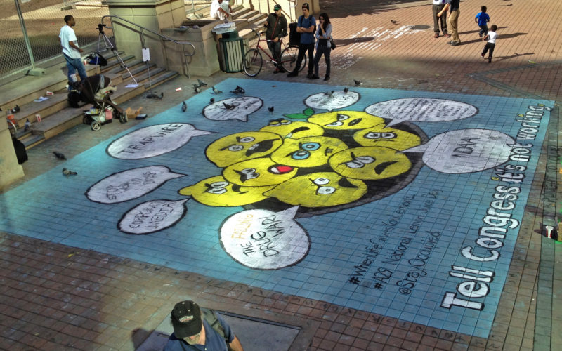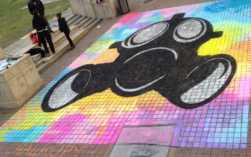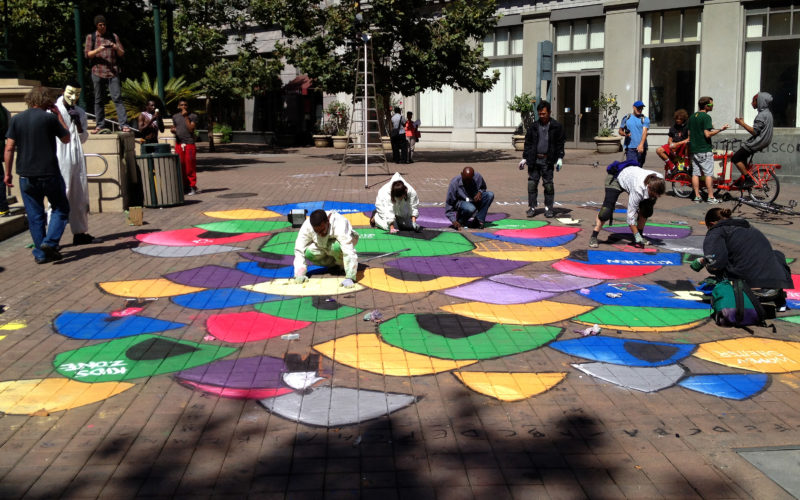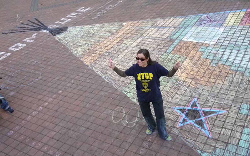 I began doing chalkupy events with a group called Fresh Juice Party that I was a founding member of back in 2011. Fresh Juice Party still chalks but they have moved into mostly a political musical group. We mapped our designs to the square’s pavers, using the existing grid as our guide. We use a handmade giant compass, triangles, t-squares, snap lines and Eternity Chalk which has the most colors. Everybody is welcome to participate by either working on the big picture with us or to do their own thing. We bring chalk, water and music for everyone who participates.