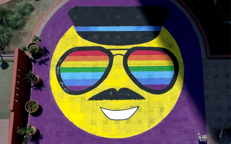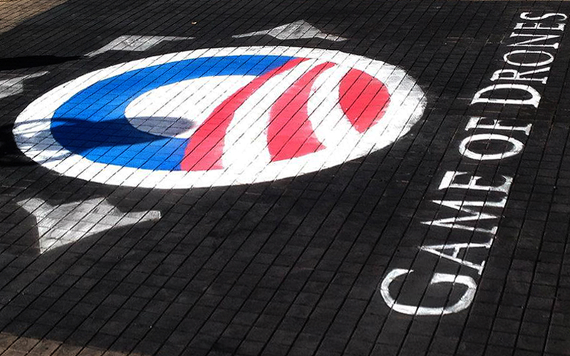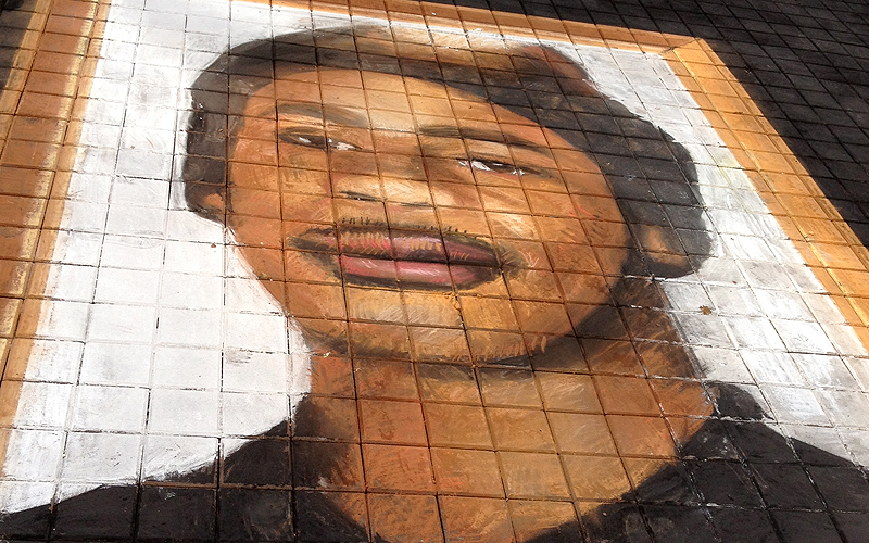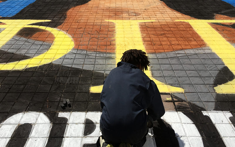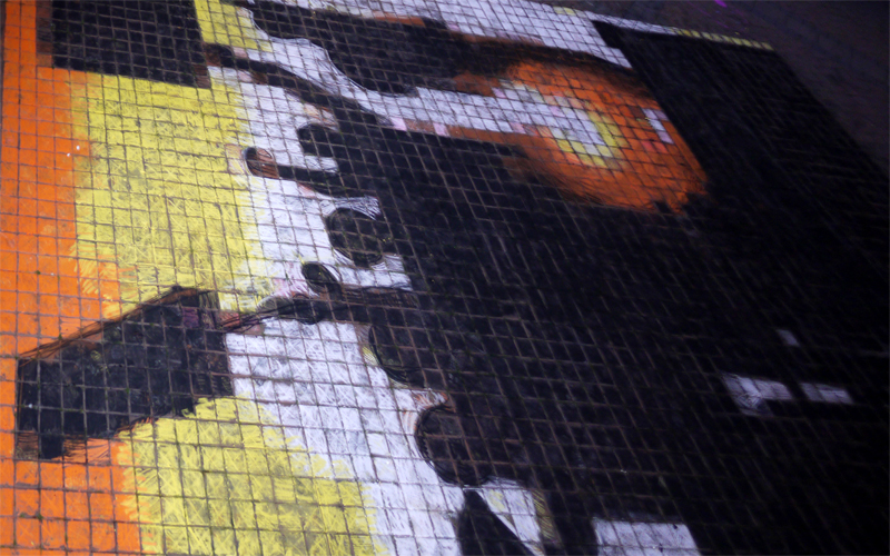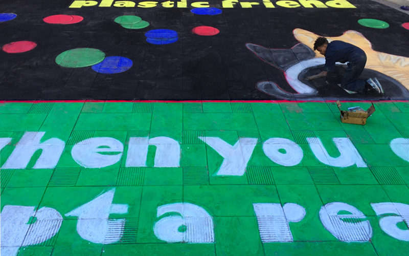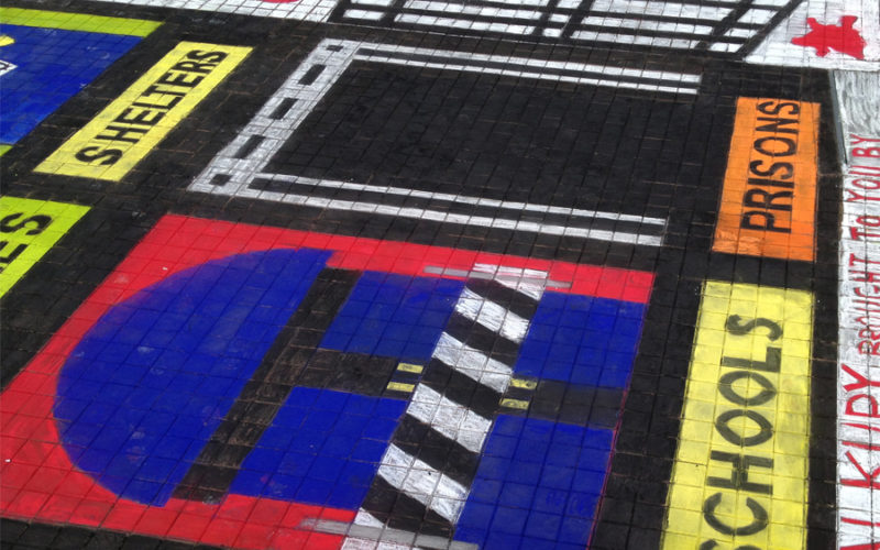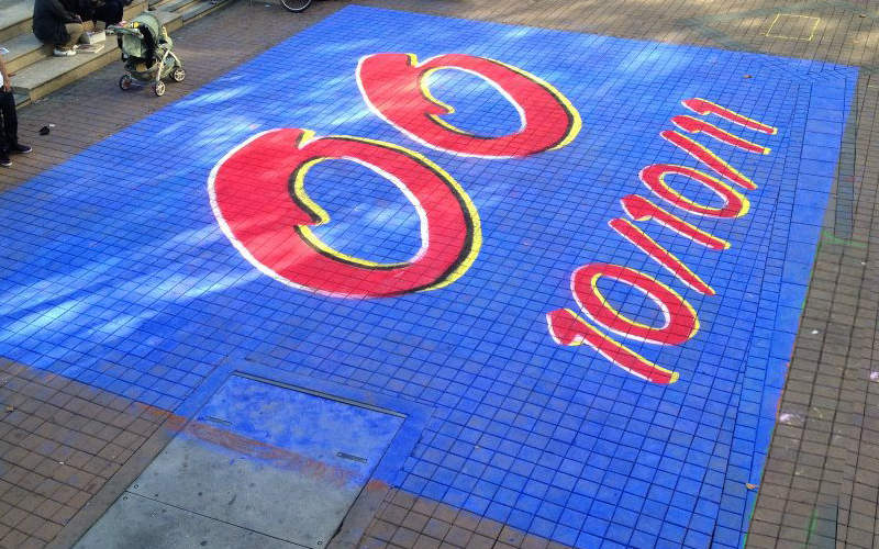 I began doing chalkupy events with a group called Fresh Juice Party that I was a founding member of back in 2011. Fresh Juice Party still chalks but they have moved into mostly a political musical group. We mapped our designs to the square’s pavers, using the existing grid as our guide. We use a handmade giant compass, triangles, t-squares, snap lines and Eternity Chalk which has the most colors. Everybody is welcome to participate by either working on the big picture with us or to do their own thing. We bring chalk, water and music for everyone who participates.