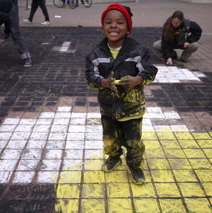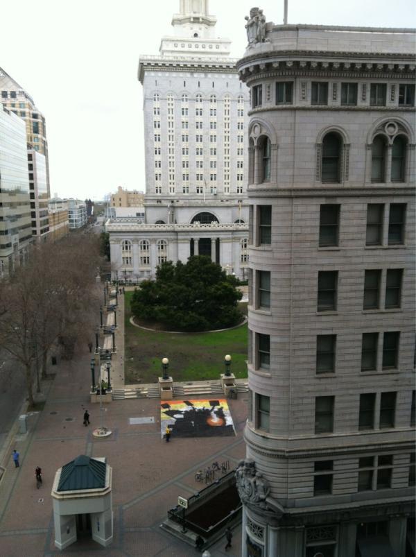 Chalk from a photo of protestors up on rigs at the port. No words. This was an attempt to chalk one of the famous, sunset photos of OO’s November port closing. It was a nostalgic image and a first attempt at blending. The chalk does not have enough gradations of color to really achieve a good gradient. It’s a challenge we still struggle with. This was the first time that someone took a photograph from a high floor of one of the buildings that surround the plaza.