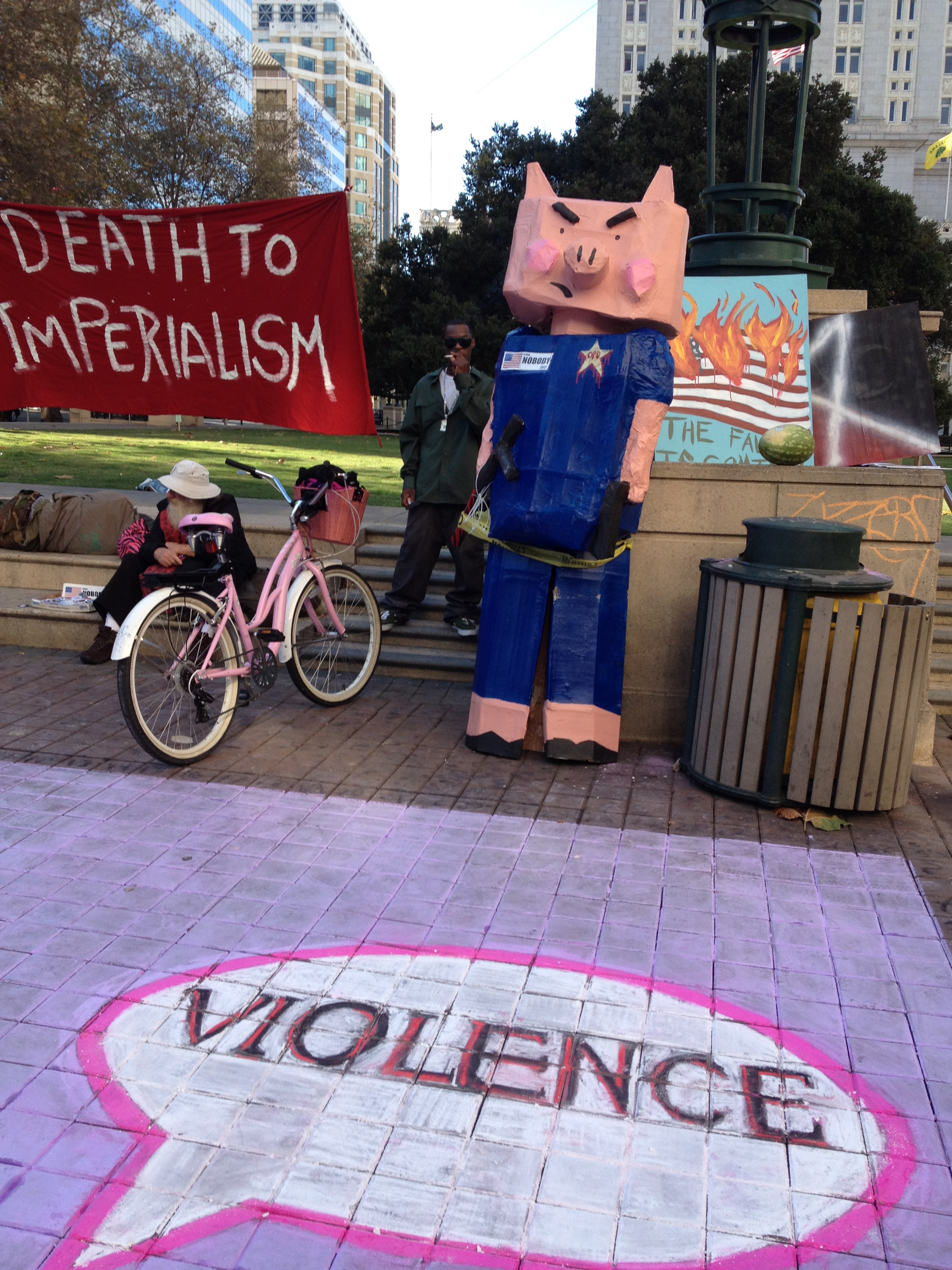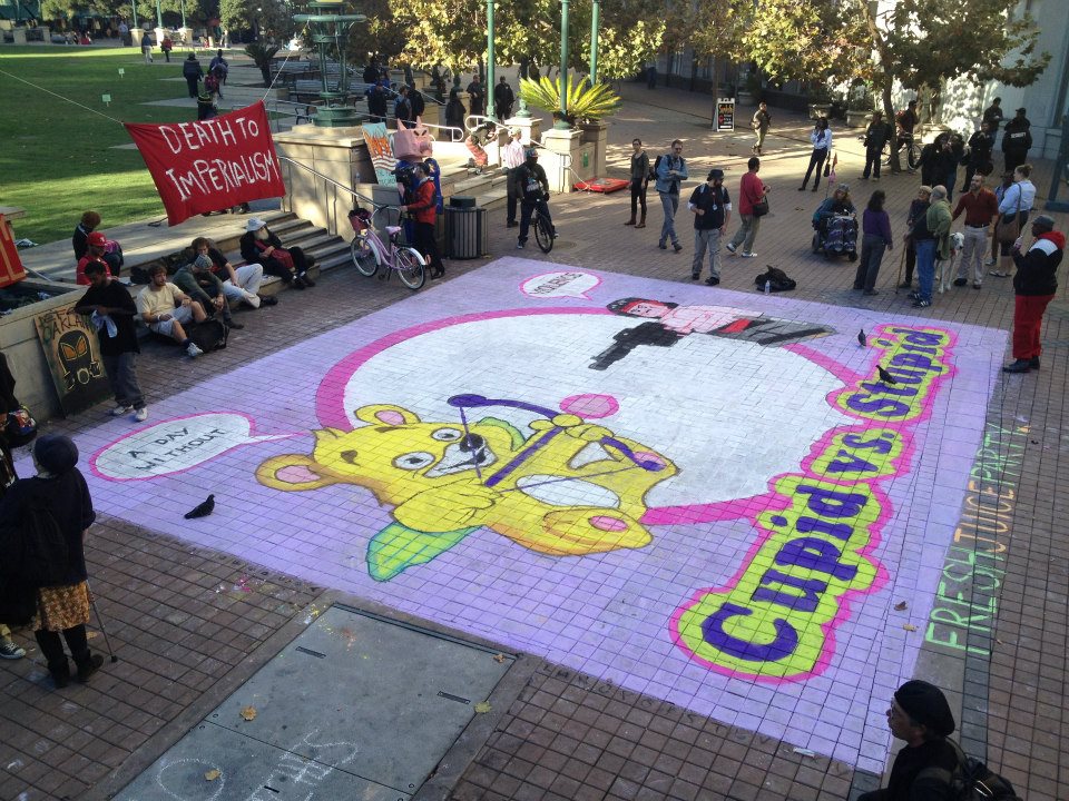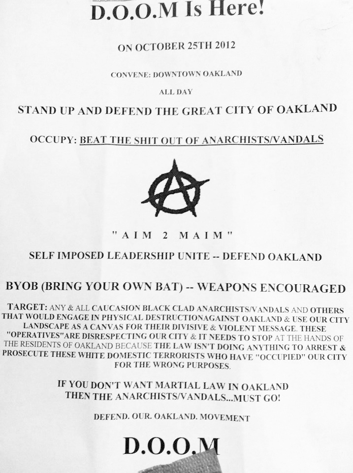 The image was a yellow bear with a heart bow and arrow shooting love at a Lego Playmobile Sylvester Stallone Rambo. The text was “Cupid vs. Stupid.” Originally Rambo’s word ballon said “smashy smashy” which was a reference to threats back and forth between the white anarchists and an who identified themselves as D.O.O.M who had posted a paper sign on the door of a prominent to the movement downtown restaurant on the square threatening to attack vandals. (see right) The date was the year anniversary of the violent removal of the Occupy Oakland camp by the police. It seemed to be mainly anarchists that were excited about it.