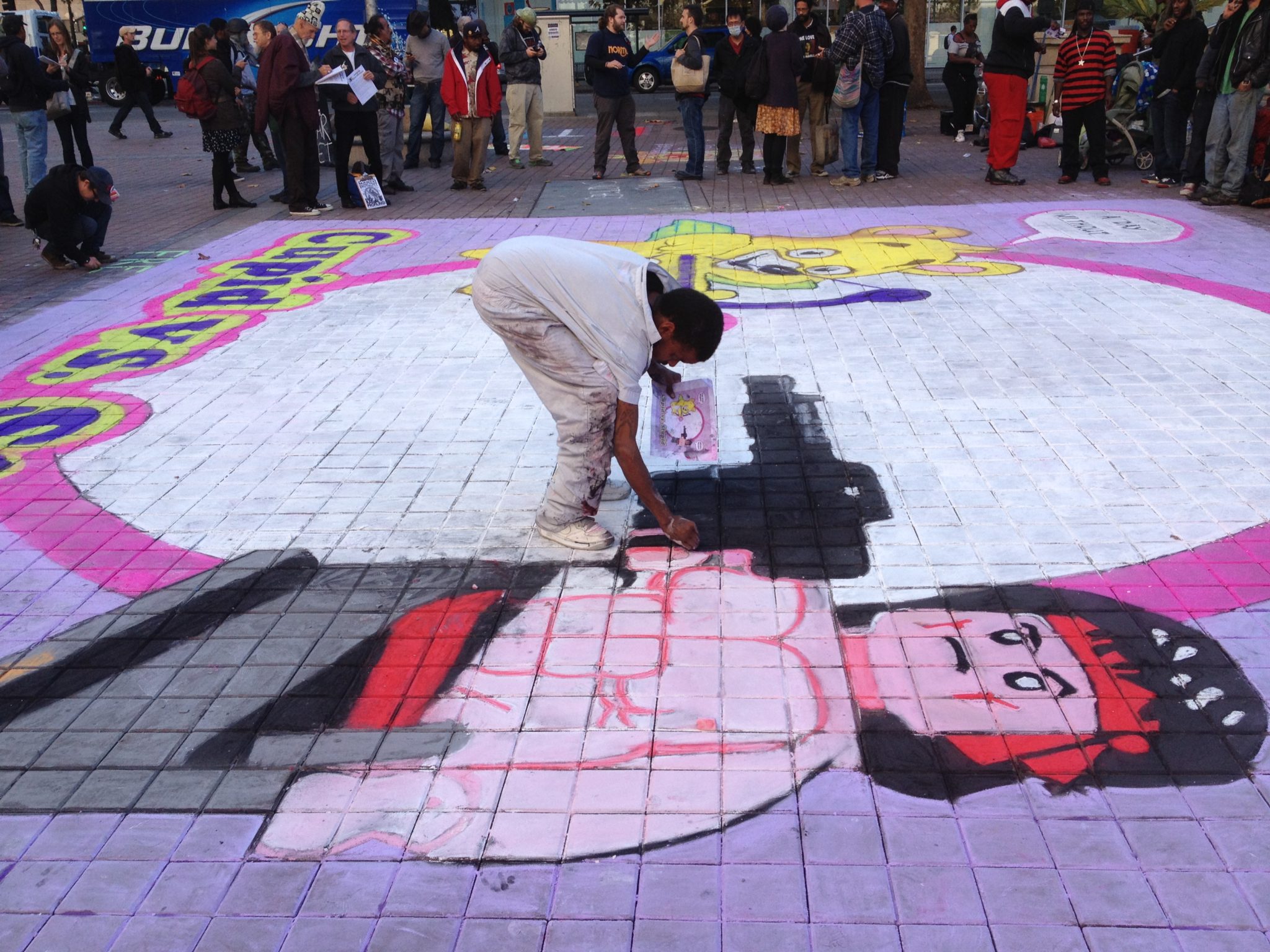 I picked the colors pink, purple and yellow to mess up the anarchist look and feel. Many of the anarchists were mad but it got complicated since a bunch of them were already chalking. They had joined us after we defended them to the VMA guys. I was annoyed at anybody even considering vandalism and voiced my opinion at the GA that preceded the day that “this was a performance not a war and we are performing for the press so why on earth would we make play right into their hands and make ourselves look bad to the people who read the stories?”