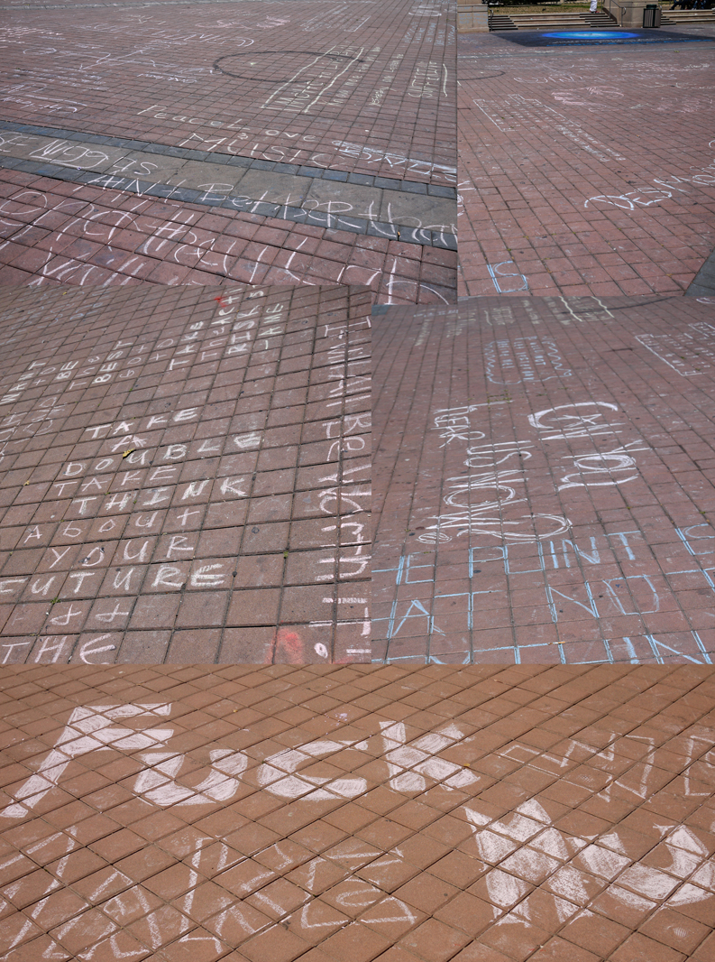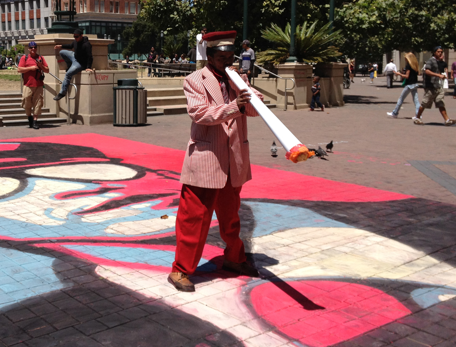 This was a special, weekday Chalkupy in honor if our “Dear Leader’s” most recent fund-raising visit too the Bay Area. I copied one someone had done with Obama decked out al Comandante style with my own reference to Kim Jong Il’s misleading misnomer. There were city workers with power washers cleaning the square of our Chalkupy that morning when we arrive at 9 AM. Overnight there had been a HUGE chalkupation courtesy of Brave New Voices, a visiting group who had literally covered then entire plaza with slogans overnight.