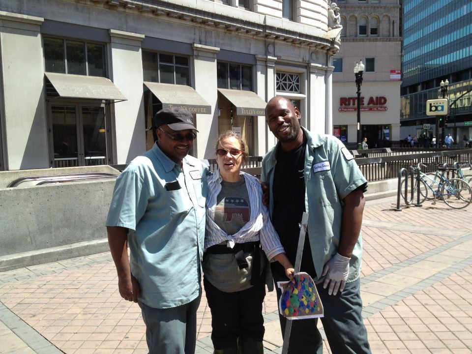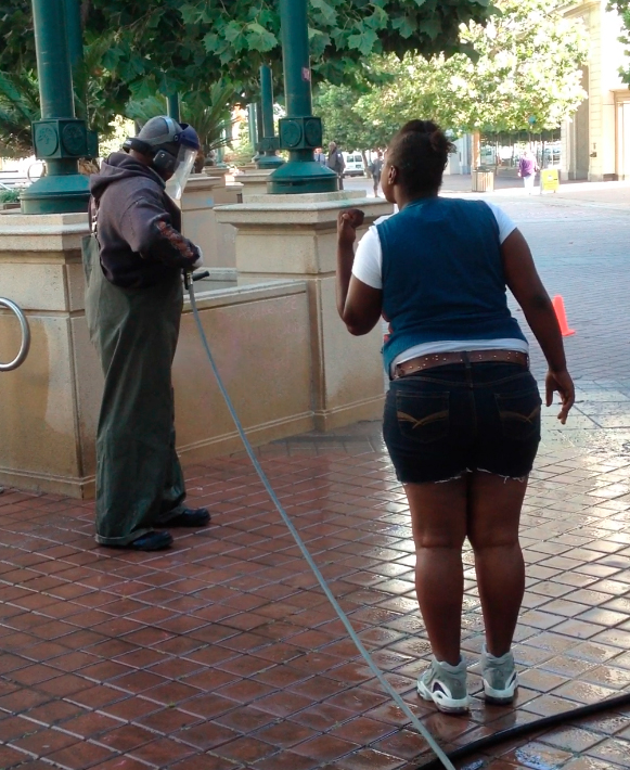 The spray guys were not in a good mood. There must have been some kind of pressure from above because normally they didn’t seem to care that much. When he saw us coming, one of the workers re-wet the area we use although he had already cleaned it, just to keep us from chalking there. We were willing to wait and in the meantime went up and down Broadway chalking “Where’s Our Change?” Our return was just a little too much for the guy and resulted in me being sprayed by his power-washer which can kill someone and so is technically assault with a deadly weapon.