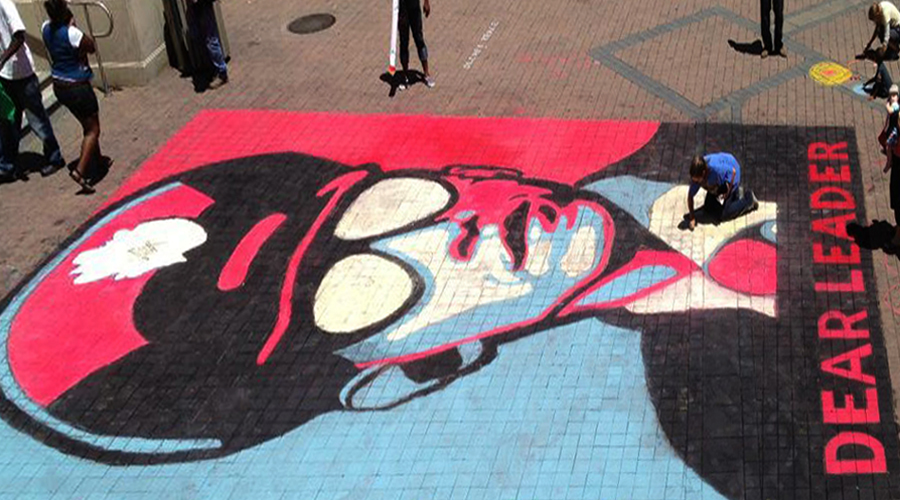 This was a take-off on Shepherd Fairey’s iconic red and blue Obama portrait with the “North Korean” tag line: Dear Leader.
