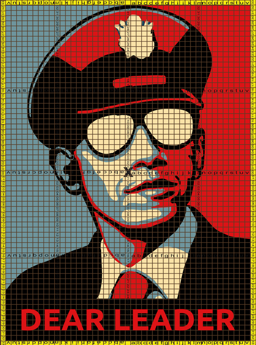 This was a take-off on Shepherd Fairey’s iconic red and blue Obama portrait with the “North Korean” tag line: Dear Leader.