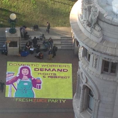 The image was a poster by local artist Melanie Cervantesof a strong, cheerful looking Latina maid with the words “Domestic Workers Demand Rights and Respect.” Melanie’s office had a fantastic view of our chalk area and she had been posting photos of our chalks on Facebook before we even knew who she was or that she was a really great artist. She came down and sighed her work. Her artwork goes by “Dignidad Rebelde.”