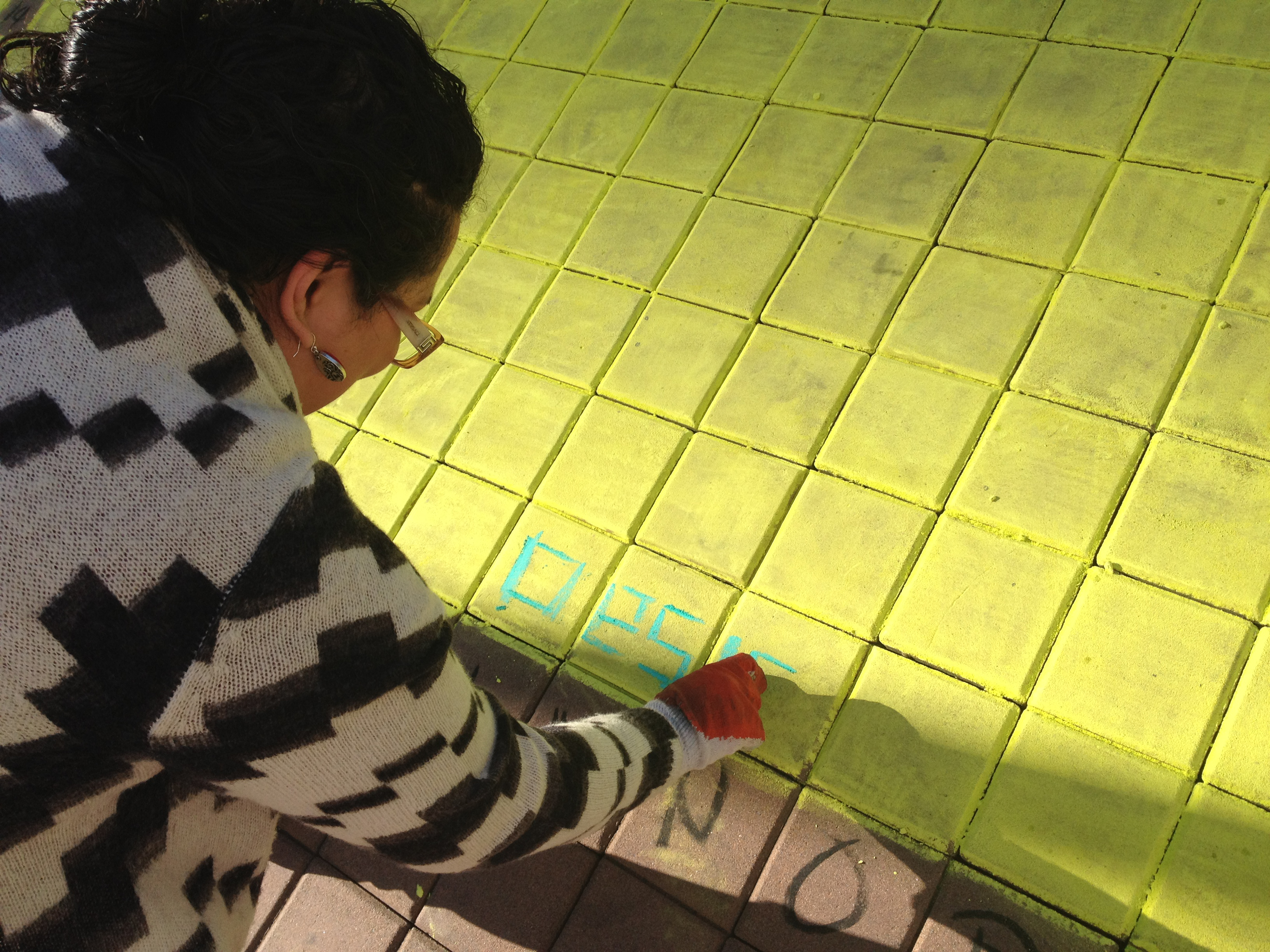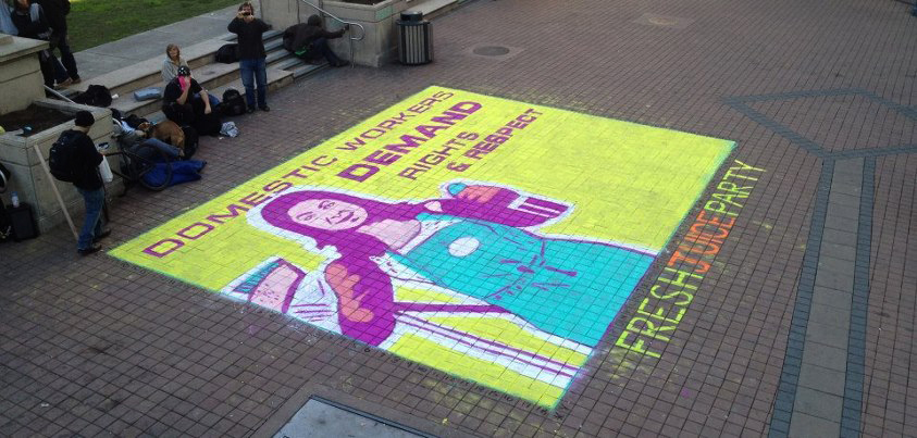 The image was a poster by local artist Melanie Cervantesof a strong, cheerful looking Latina maid with the words “Domestic Workers Demand Rights and Respect.” Melanie’s office had a fantastic view of our chalk area and she had been posting photos of our chalks on Facebook before we even knew who she was or that she was a really great artist. She came down and sighed her work. Her artwork goes by “Dignidad Rebelde.”