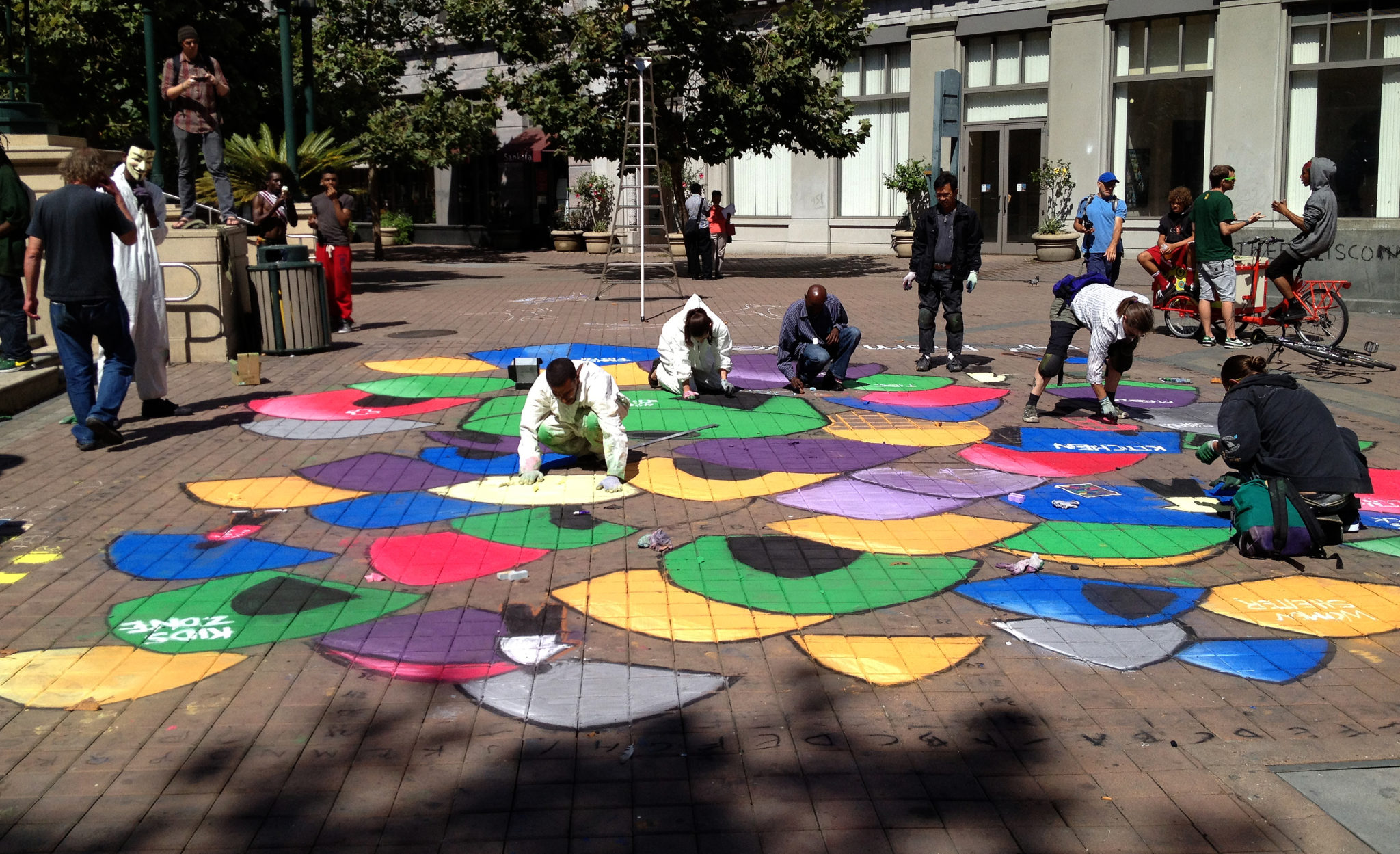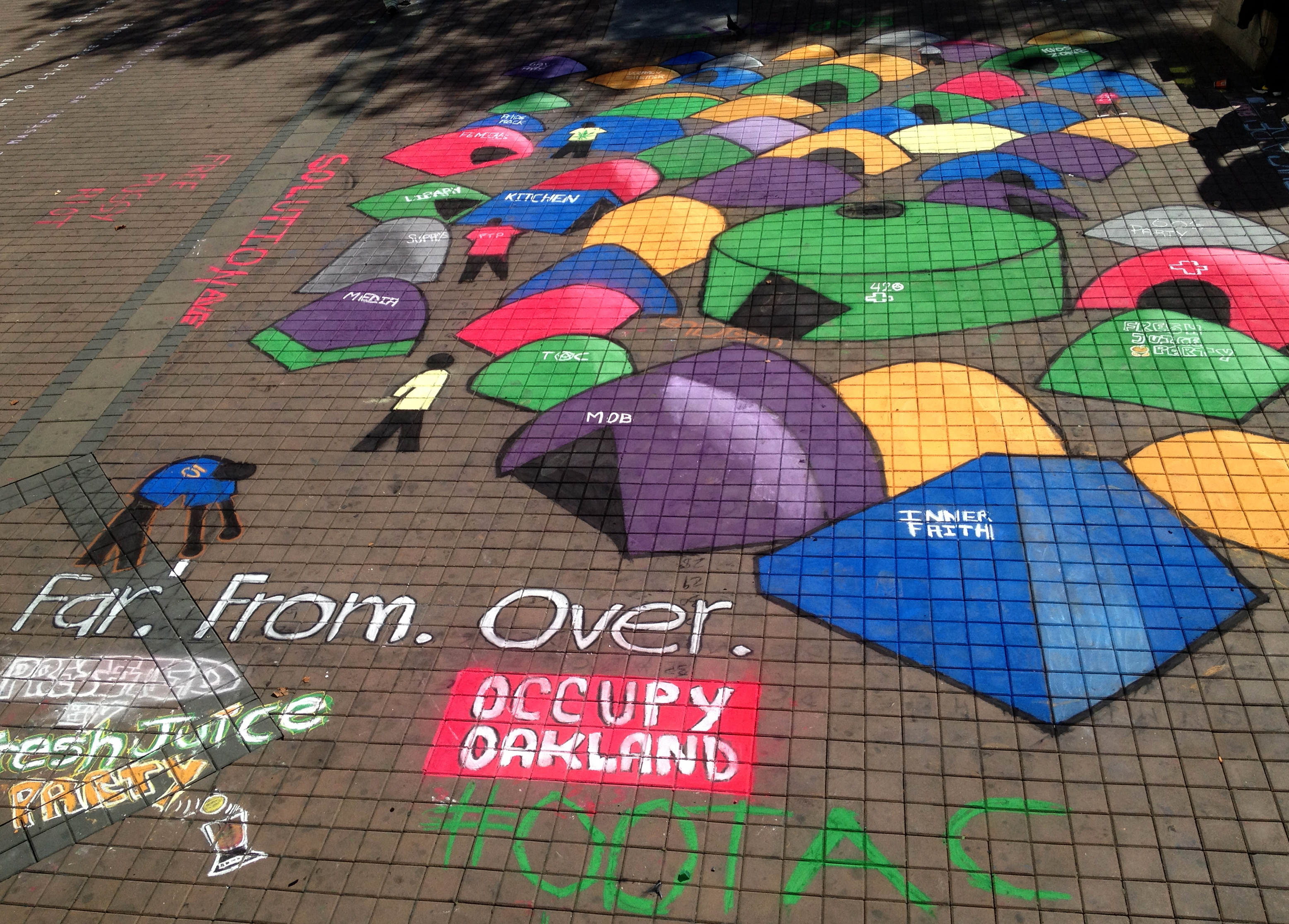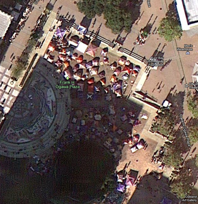Image is a recreation of the Occupy Oakland tent camp. While in LA our streamer friend Punk Boy pointed out that if you zoomed in on Google Earth that OO’s tents were still in the plaza. I decided to try and recreate this by drawing those same tents back onto the pavers so that it would look from a window like they were back.