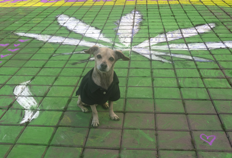 The crew really got into drawing the pot leaf though and started in on a little, spontaneous improvisation, adding blood to the officer’s club as well as some purple kush color to the originally white leaf. This went on be a tradition with one of my first regular chalkers: Teardrop, aka DJ Occupy, artist, talented free-styler, brilliant clown and guy who loves to color out of the lines. Teardrop is known to livestream fans for his antics and comic irony. We ran out of green so we just let people write stuff in the empty area. One of my worst chalk habits is running out of a color. It takes about two boxes (72 sticks each) to do a background of a chalk about 20 square feet.