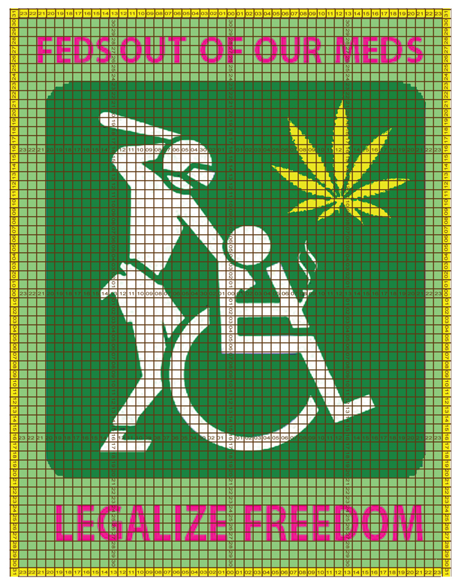 The icon of a cop beating the icon of a wheelchair guy who apparently was smoking. (Smoke lines coming from him) A marijuana leaf in the corner. Tag line: Feds Out of Our Meds. We did this chalk because the Feds came and busted Richard Lee and others from the Oaksterdam community.