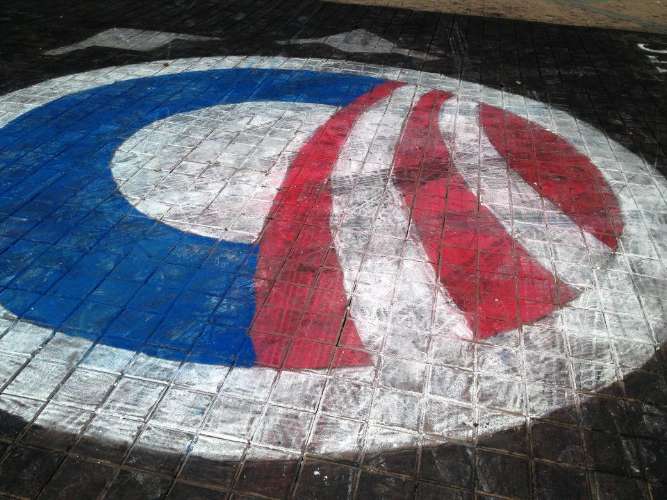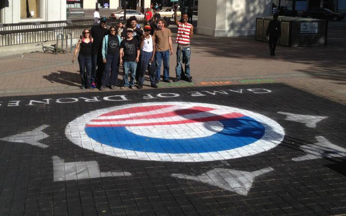 This was the Obama “O” logo with drones surrounding or “emanating” from it. Tag line: Game of Drones. Drones usher out the era of heroism. This Chalkupy was in response to Obama’s joke about who to kill next. Mixing the metaphor with the popular TV show: Game of Thrones, I juxtaposed drones that were reminiscent of the swords that formed the iconic Game of Thrones throne and arranged them in the same circular fashion around the Obama campaign “O.”