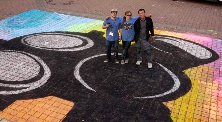 By now though Foxx, Josh and Monique had become regulars, soon to be joined by Kris K, Bud, Barbara, Torricka, Scooby, Theresa, Isaac, Melvin, Lady G, Tamarr, Pastor Preston and others. People were showing up regularly on Fridays. This was lucky because after all those physically exhausting ovals, the hard chalk might eventually have caused us to give up, had we not so much kind help from the people we had met there in the Plaza. This design was an attempt to have fun with the available chalk colors before we found a better source. When the drawing was done a rasta guy rubbed the colors into his hair. Sorry that I don’t have a picture of that.