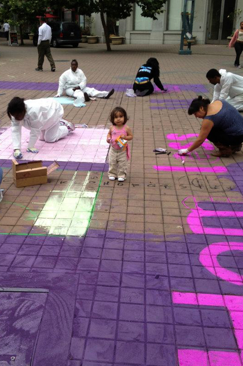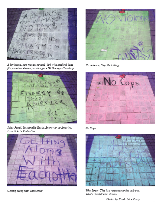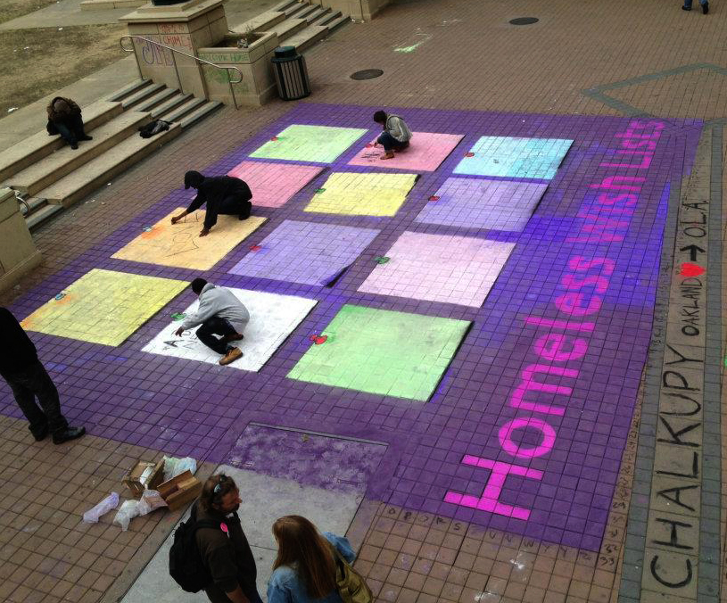 When you are homeless in downtown Oakland, they will chase you off of benches, sidewalks, anywhere you try to sleep is off limits. Shelters fill up. It’s like homeless people don’t even have a right to exist. This was the first time that Fresh Juice Party Band played at the plaza. Craig had been in the habit of bringing some speakers and an ipod stacked with various protest songs and the Hip Hop favorites of our chalkers, inter-spliced with some of Fresh Juice Party’s own music including the instantly popular Chalkupy song.
