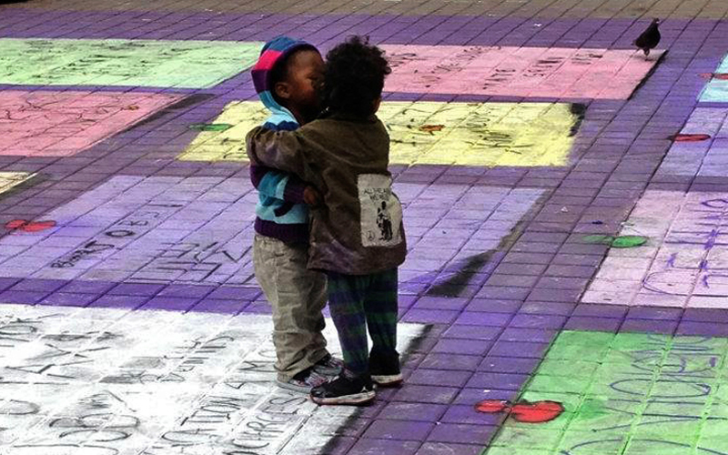 We gave out socks for the occasion. Socks are something homeless people almost always need. And between the music and the sharing there was a real feeling of human love and connection that day. 2 little kids started hugging each other, standing on the chalk and we got some really cute pictures. Final artwork Loving feelings.