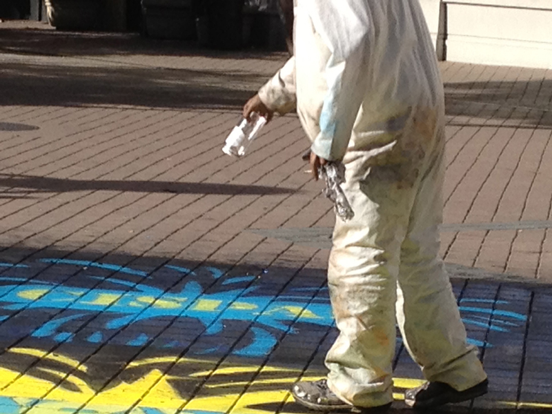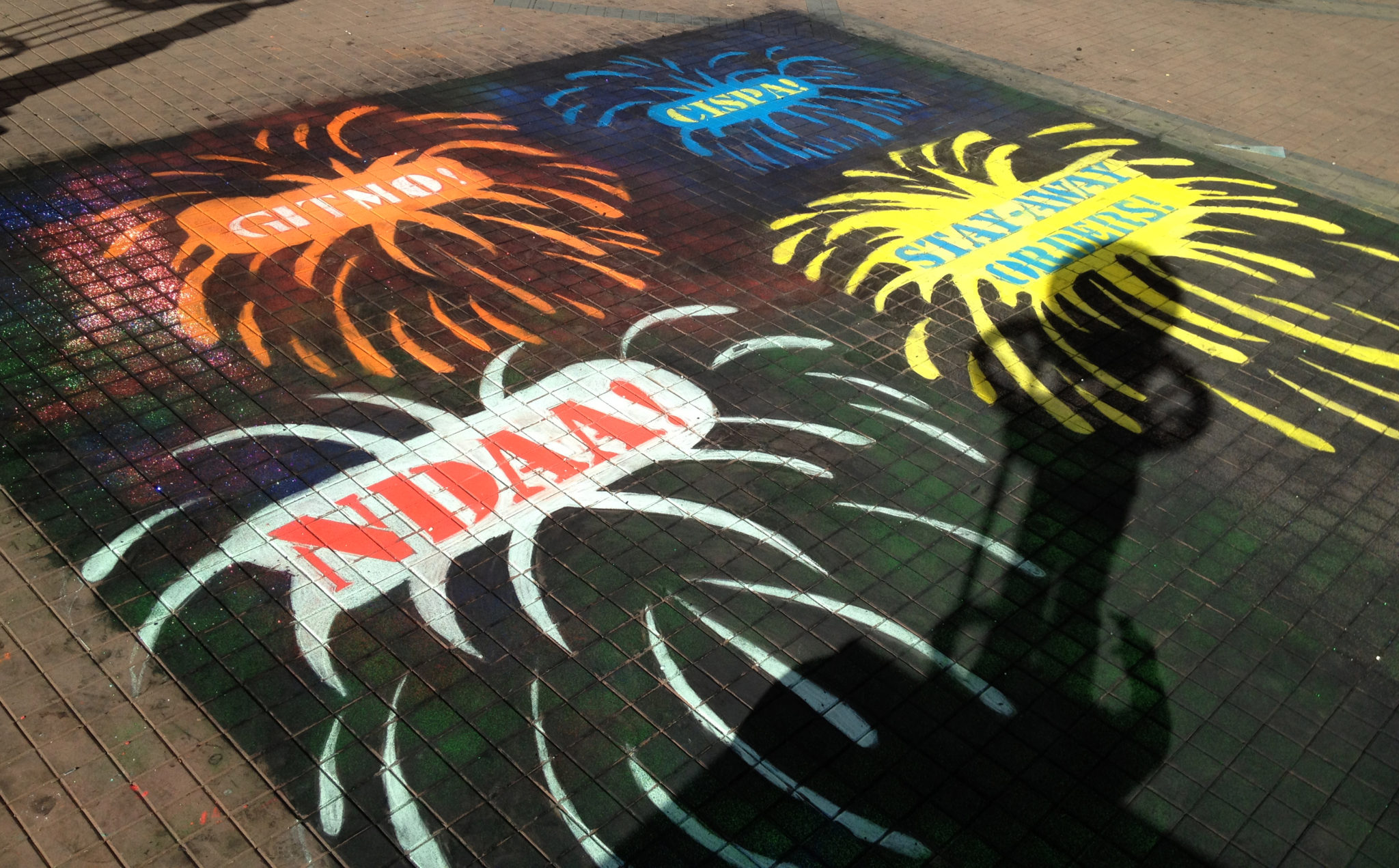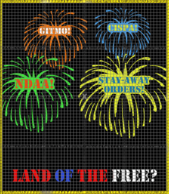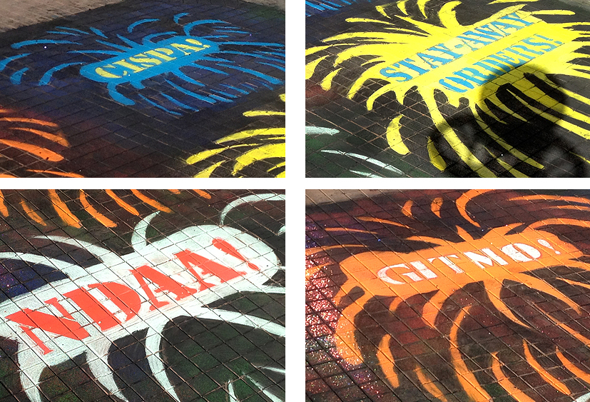 This independence day we decided to lament lost freedoms. I designed fireworks with the words: Gitmo, NDAA, CISPA and Stay-Away Orders in the center of the fireworks that begged the tag-line question “Land of the Free?” I had to practice various styles of fireworks before I found one that I thought would work in chalk. It was really easy, when blending the colors with the black, to create an ugly grey mud. The failed, first experiments adorned my driveway until the winter rains washed them away. Testing things has saved me many a bad experience in the field.
