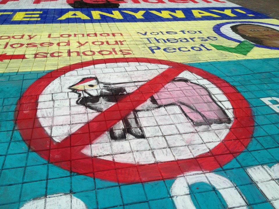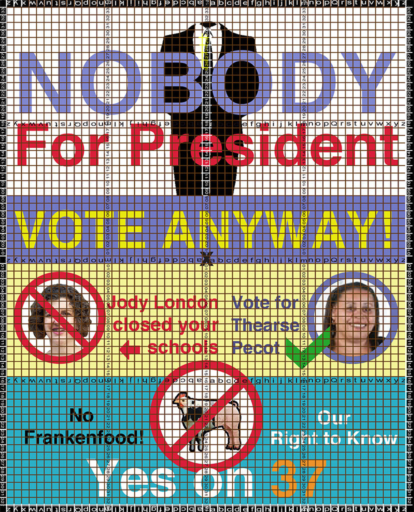 Wavy Gravy was the originator of the Nobody for President meme. It’s a great one because you can say things like: Nobody cares, Nobody will change anything, etc. Board of Education Director, Jody London (the villain of our school closing chalk) was running for reelection and we definitely wanted to pitch for her opponent, Thearse Picot. (London won anyway.) AND we felt compelled to remind people to vote “YES” on the GMO labeling Prop 37 just one moor time with a franken-food pig/chicken/ cow. (Prop 37 lost anyway.)