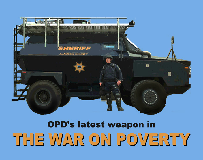 Image was the Oakland antipersonnel tank and the tag line: Oakland’s latest weapon in the war on poverty. Copblock. org announced that they were having a chalk the police contest. We wanted to win and we did. We worked extra hard on our message. I think it was Drew Philips, an occasional chalker and friend, who actually came up with the clever tag line. I especially liked this design because there was something for everybody, a figure, lots of mechanical and detail stuff.