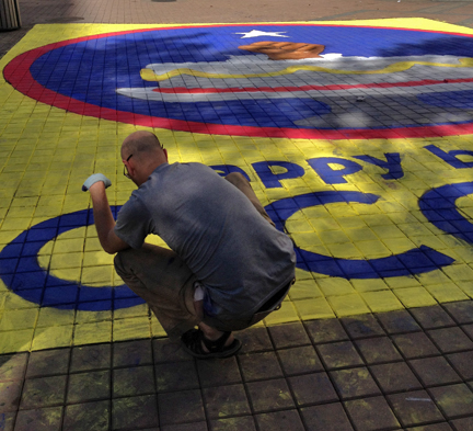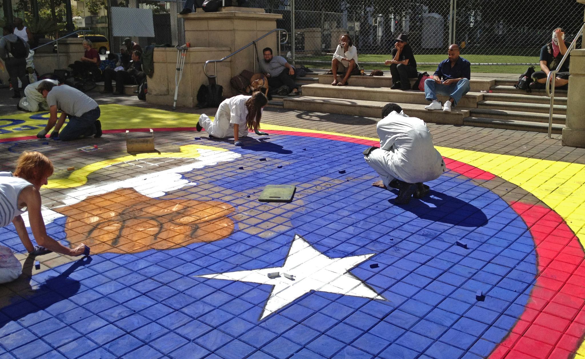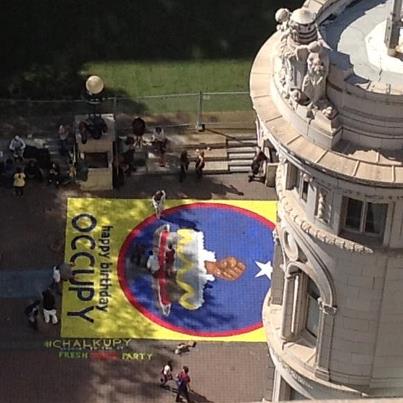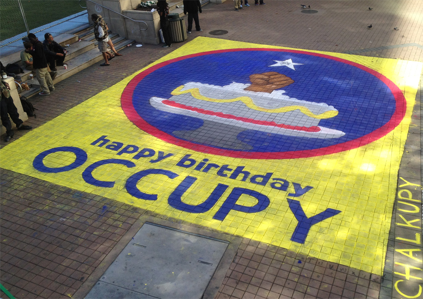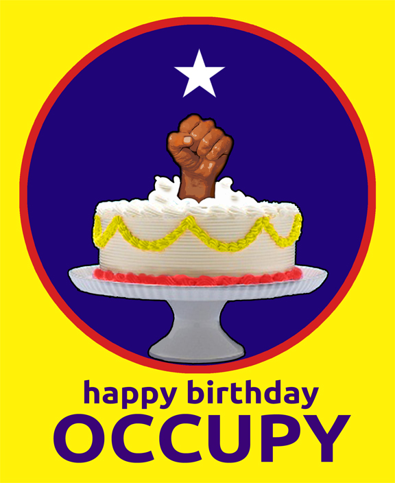 The design was a giant birthday cake with a fi st coming out of it, reaching for a star and the words: Happy Birthday Occupy. September 17th, 2012, the anniversary of Occupy Wall Street. I chose the colorful design because it’s just more fun to use bright colors. Also because of the red white and blue.