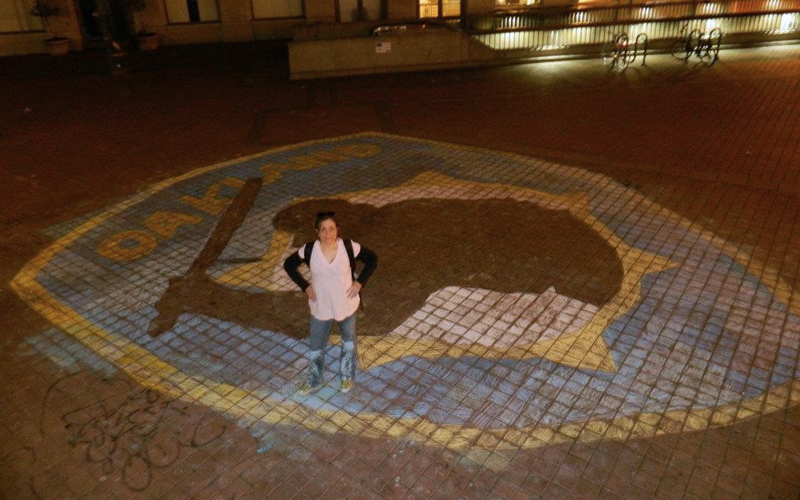 The police accused them of breaking into the Y but that was later proved untrue in court. Those arrested there were awarded a large settlement. The badge was in response to several incidents of police violence in Oakland, including the shooting of veteran, Scott Olsen. It might be redundant to say that this was a direct, in your face message to OPD. The thing I remember from the speeches that day was a man, I don’t know who he was abut he said “Do your best.” That day the police helicopter was right above it, hovering and shining its spotlights down on our badge. When there were no retaliations we figured we were getting away with it. We didn’t have the right blue. Having yet to discover the superior brands, our colors were very “chalky.” We didn’t finish until after dark.