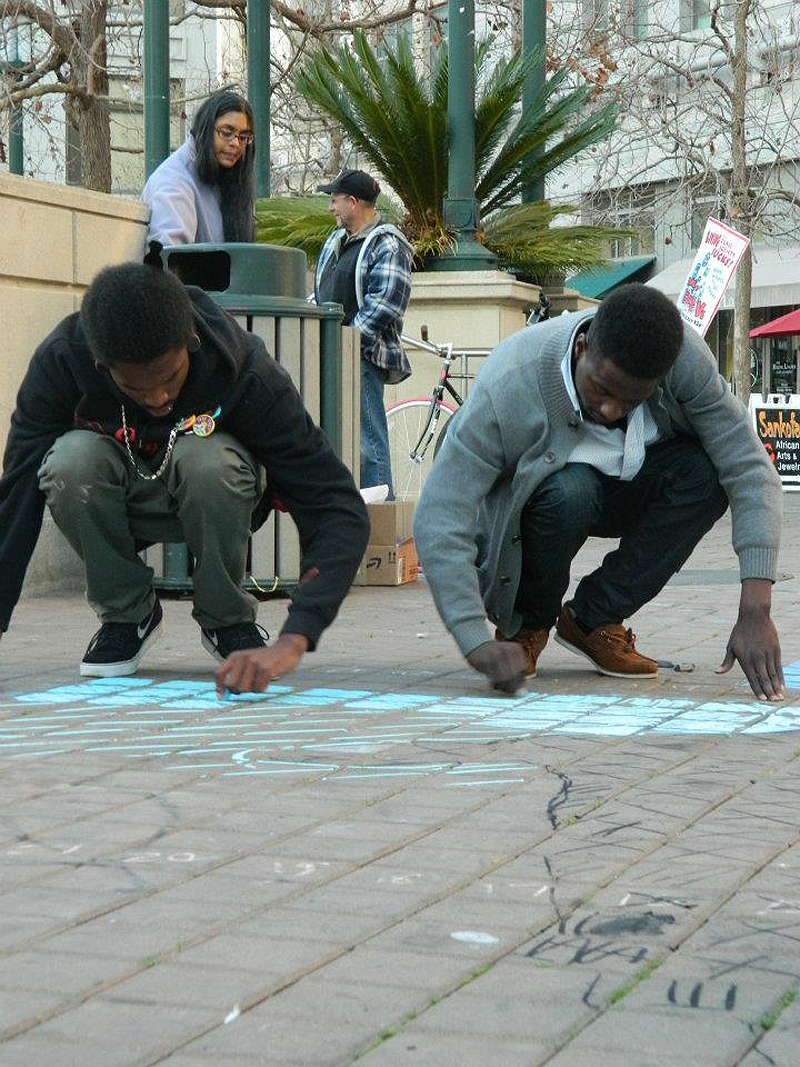 This chalk was for “Move In Day,” the day Occupy Oakland tried to take the Henry Kaiser Convention Center for its own. It was a bold move that did not succeed but the march was very eventful; with teargas and over 400 people arrested as they ran through the YMCA.