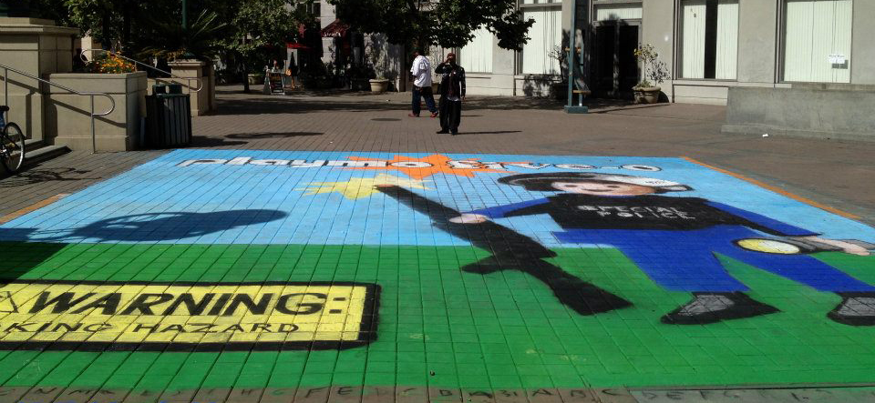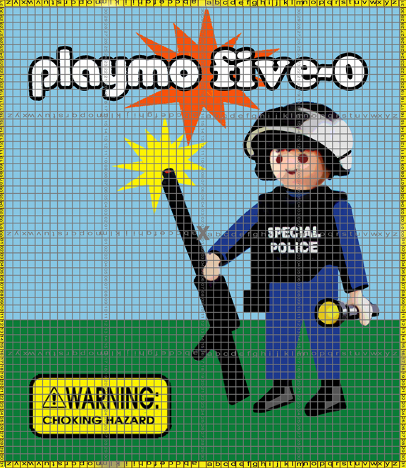 This was a picture of one of those Lego Playmobile cop characters. With the tag line: Playmo Five-O. The corner had a tag that said “warning choking hazard.” Playmobile just begs satire. I seriously doubt the advisability of encouraging Junior to make arrests. A two-in-one satire opportunity not to be missed. Cute and friendly, innocent and insulting, Mr. Toy Cop was the man for the job.