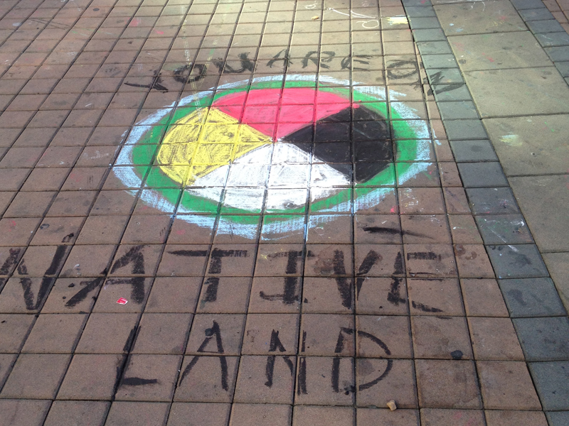 Running Wolf is an American Indian, tree sitter and activist. He often want’s some chalk for his own work, colors for a red, black, white and yellow “4 directions” piece around the flag pole. At the time, Running Wolf was running for mayor. It was unlikely that he would win. I once gave him some nice climbing ropes to tree sit with but he left his post and they all got cut down. He blamed it on some kids leaving THEIR posts but clearly he left as well. Not that I blame him. You don’t see me sitting in a tree.