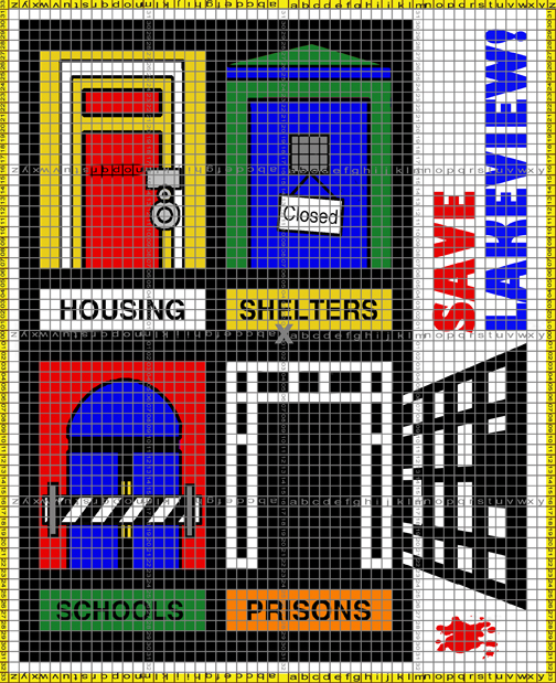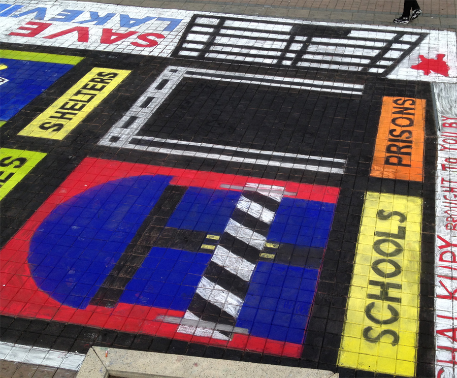 The tag line was: Save Lakeview. School Board’s Jody London moves to close small, local schools and bus local kids out to new, mega-school miles away. Parents are furious. They occupy Lakeview school and start their own, free school there. The police took over the school a few weeks later and Jody London spent tens of thousands on office dividers for the newly converted building. Inspired by one of the many, politically witty sketches that my cousin, Sarah Longstaff, posts to Facebook, I adapted one for this occasion. Schools, libraries and shelters are closing doors. Only the prisons remain open. Even though almost every line was along the edge of a paver, the complexity of this design made it harder than I had expected.