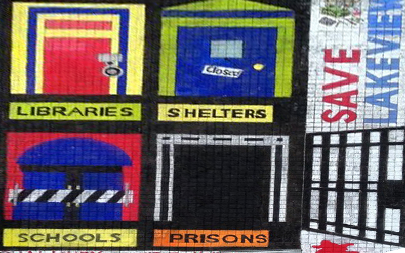 The image was four doors, one a closed library, one a closed school, one a closed shelter and the fourth an open jail cell.