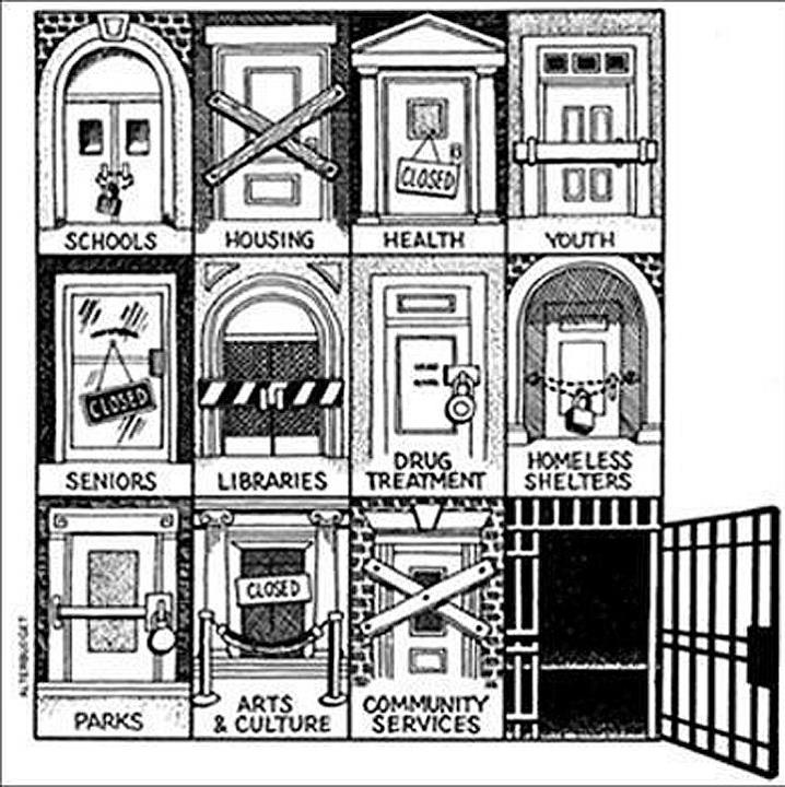 The image was four doors, one a closed library, one a closed school, one a closed shelter and the fourth an open jail cell.