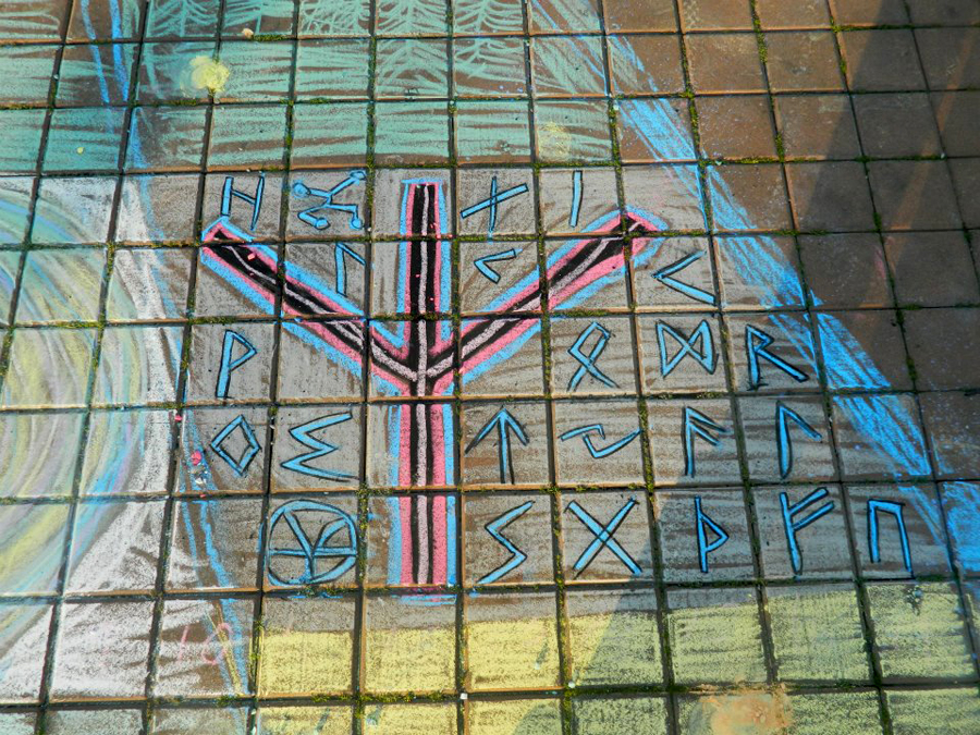 The image was tipi to represent the tents of Occupy. The tag line was: Commune. Dandelion’s requested this chalk theme. OPD had just removed the last, symbolic tent at the plaza, a lone tipi that had been erected. I designed a plain, white tipi to allow inter-activity. People colored it in with their own designs.
