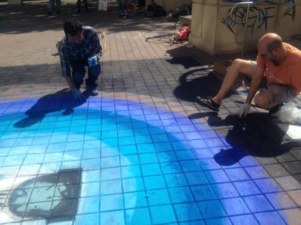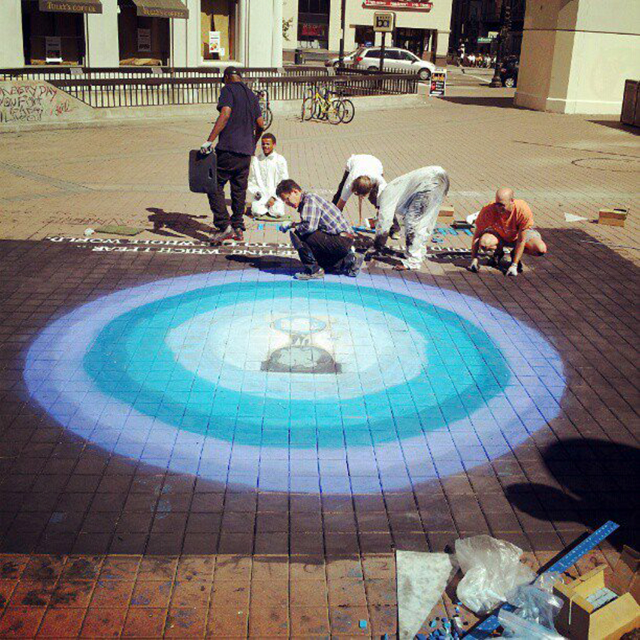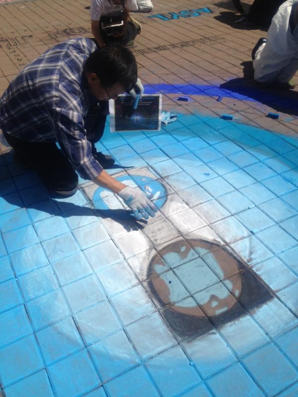 Another attempt a doing a smooth gradient. We drew concentric circles in hopes that confining colors to an exact range would control the effect. The turquoise stood out like a sore thumb though and this was one of the least successful designs in my opinion.